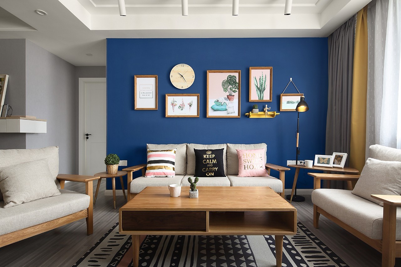 原木色布藝沙發撞色深藍色墻布的背景,突出木作家居給予空間的原生態環境