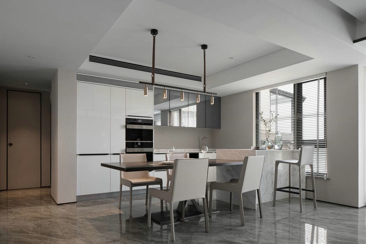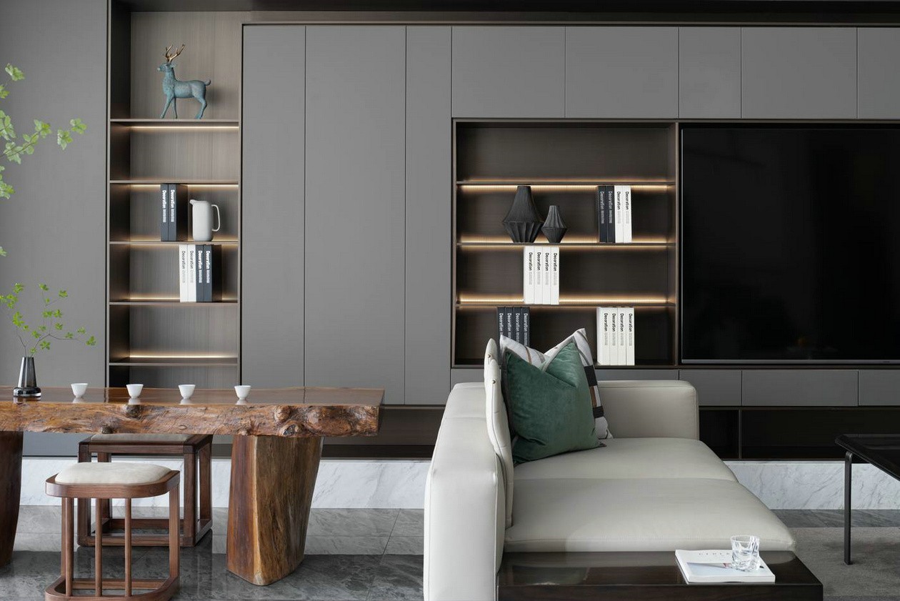 客廳茶室一體結合的做法,使空間體量有所增加,開闊的空間體驗也在無形中影響著業主的生活模式。